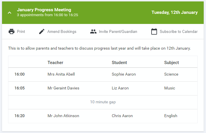 Please note that a maximum of TWO guests can use this link. Anyone else using it (including the parent that sent the invite, who should log in via their own confirmation email) will knock the guest out of appointments.